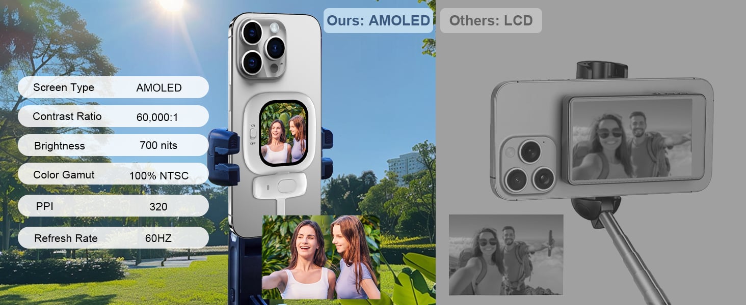 Vibrant, clear visuals even under sunlight — perfect for video calls, outdoor shoots, or checking your framing.